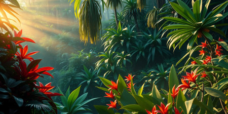 Explore a vibrant tropical jungle scene showcasing lush greenery, sunlight streaming through foliage, and bright red flowers in a serene environment.