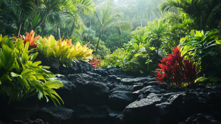 Dark volcanic rock platform surrounded by tropical plants, creating a rich contrast with vibrant vegetation. generative ai