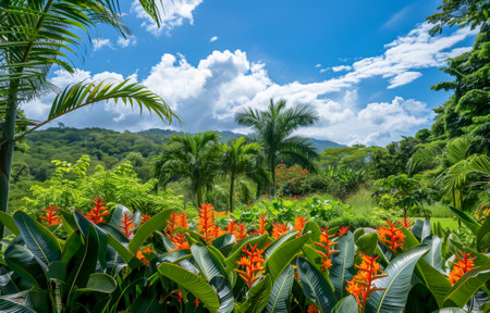 Lush tropical garden featuring vibrant orange flowers, palm trees, and a scenic mountain backdrop