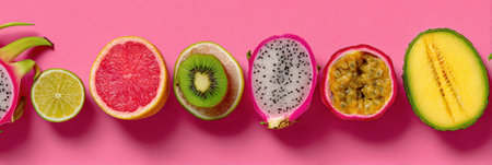 A colorful array of tropical fruit halves arranged on a bright pink surface, highlighting their juicy textures and vibrant colors for a lively aesthetic.