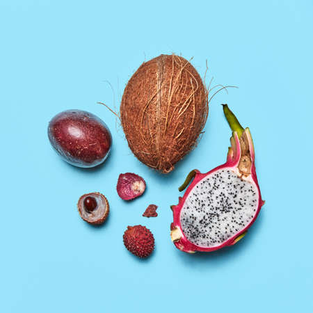 Set of exotic fruit pitahaya, lychee, passion fruit, coconut on a blue background with space for text. Food layout. Flat lay.