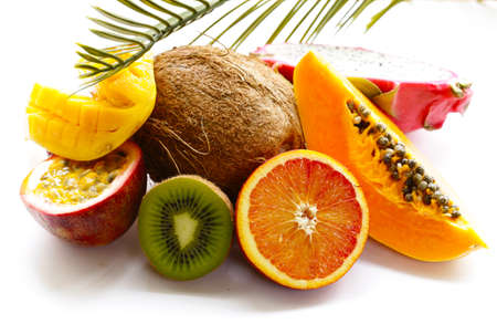 Assortment of exotic fruits on white background with copy space