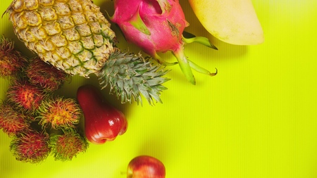 Set of exotic fruits on yellow background.