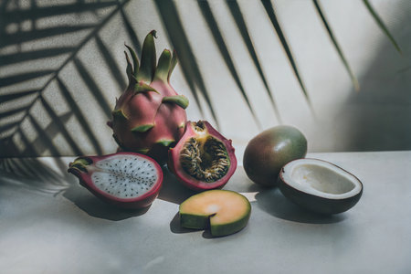 A vibrant still life featuring dragon fruit, passion fruit, and other tropical fruits, dramatically lit against a palm leaf shadow.