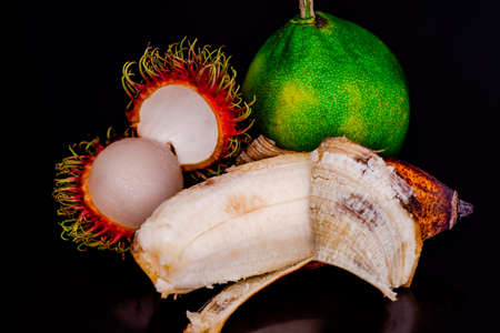Colorful Rambutan, Banana and green CItrus in black background.