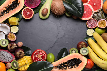 Frame of different exotic fruits on black background, flat lay. Space for text