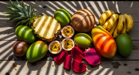 A vibrant flat-lay arrangement of tropical fruits including pineapple, mango, banana, dragon fruit, and passion fruit on a wooden surface with palm leaf shadows. The image showcases the variety and freshness of exotic summer produce.
