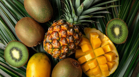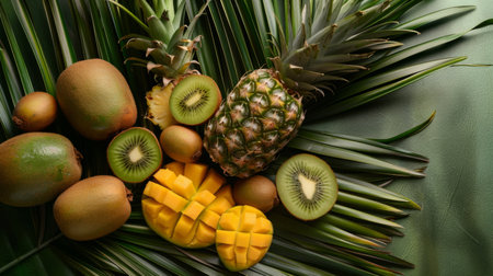 A composition of tropical fruits (kiwis, pineapples, mangoes) on a palm leaf background generative ai