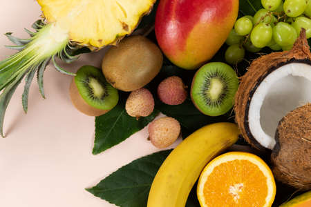 Top view of a composition with variety of fresh tropical fruits and green leafs arranged on a pink surface.
