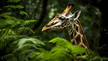 A stunning portrait of a deer nestled within thick tropical foliage, highlighting the enchanting beauty of wildlife in its natural habitat.