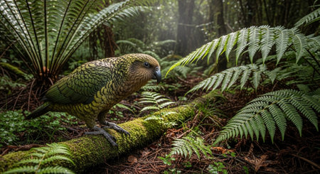 Vibrant green parrot perched on branch in dimly lit, natural environment