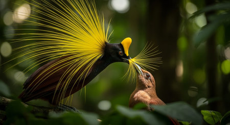 A charming scene featuring two colorful tropical birds expressing affection amidst vibrant green foliage. This intimate moment captures the beauty of nature's wildlife.