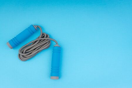 Skipping rope or jumping rope isolated on blue background. Selective focus and crop fragment