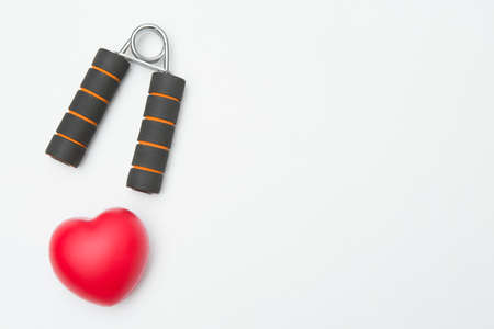 Hand grip and Heart shaped squeeze ball for hand muscle exercise on white background and copy space