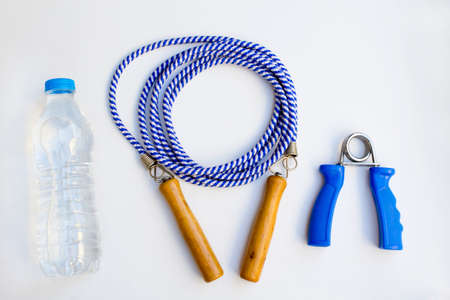 Flat lay style fitness concept. Jump rope, bottle of water, expander. Sports equipment on blue background. Top view