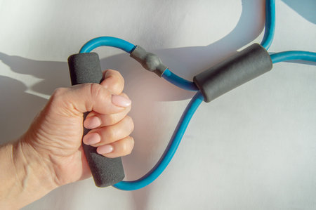 A womans hand squeezes a rubber strength training espander, demonstrating arm exercises to improve fitness and rehabilitation