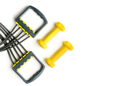 Flat lay composition with expander and dumbbells isolated on white background. Healthy lifestyle concept.