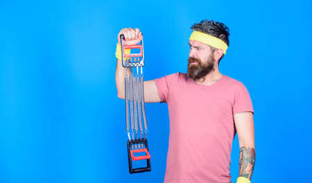 Athlete workout with expander. Man bearded athlete exercising with expander. Guide use expander proper way. Sportsman training stretching expander. Try stretching exercise. Athlete sport instructor