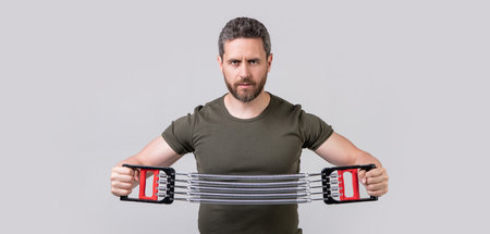 sportsman with resistance expander isolated on grey background. sportsman with resistance