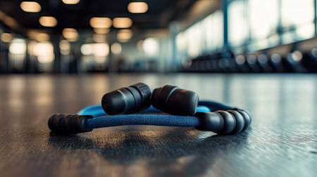 A close-up of a high-performance skipping rope with adjustable handles placed on a gym floor