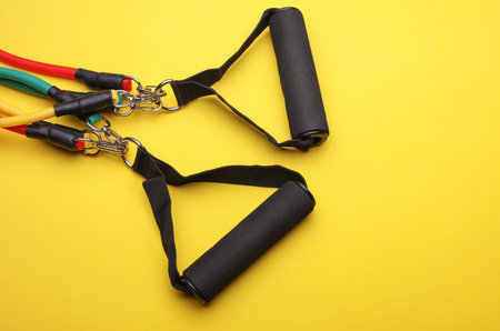 Rubber expander with handles for fitness on a yellow background