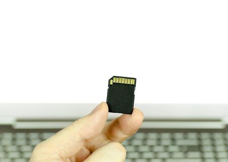 Close-up view of a hand holding a black SD memory card with a laptop, isolated in white background