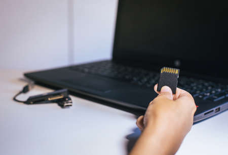 flash card in hand on camera and laptop background, memory card for SLR camera, flash drive, photo storage, photographer's workplace