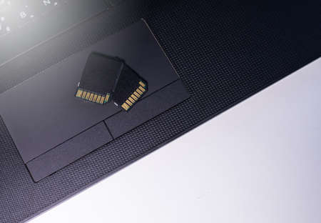 SD memory cards and laptop on table, closeup