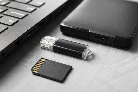 Usb flash drive, SD memory card and laptop on grey textured table, closeup