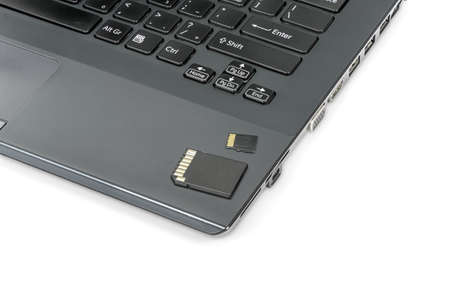 Memory card and adapter on laptop isolated on white background