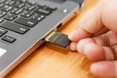 inserting sd card memory drive plugged into a computer laptop port.