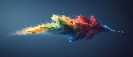 A burst of colorful paint particles disperses in all directions against a dark background, forming a stunning display of vibrant hues and dynamic patterns.