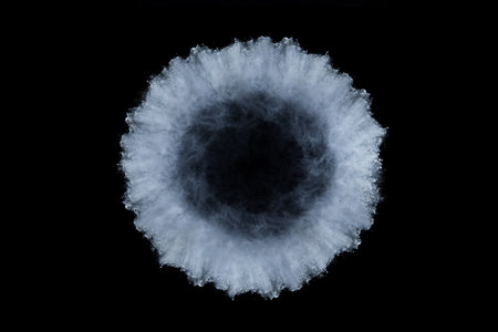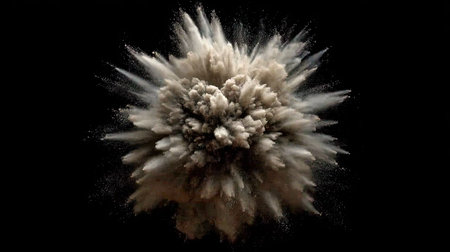 An explosion of particles is captured against a black backdrop, showcasing a radial composition. The central form appears voluminous, emitting dynamic energy. The color palette consists of neutral tones, possibly dust or smoke, creating contrast. This image could be used for various design, commercial, or illustrative projects.