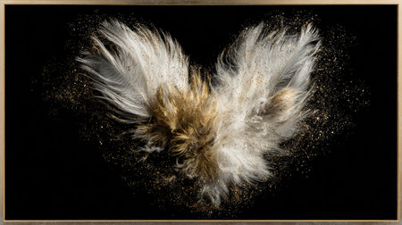 This striking abstract artwork features elegant wings made of white feathers accented with gold sparkles against a rich black background, evoking a sense of beauty and grace.