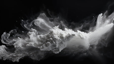 A spectacular explosion of smoke and liquid particles captured in high contrast monochrome, depicting movement and chaos.