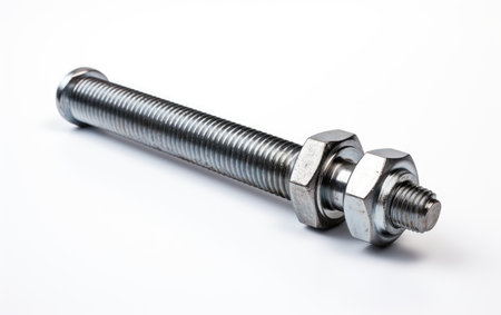 Close-up of a metallic bolt with a threaded shaft and hexagonal nut on a neutral background.