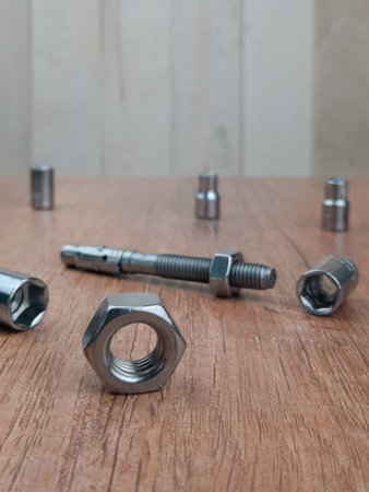 Steel nuts and bolts close-up on wooden table