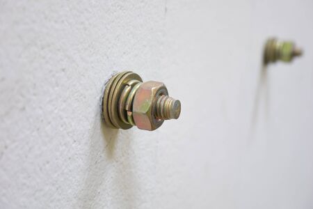 Close up , bolt and nut on wall.
