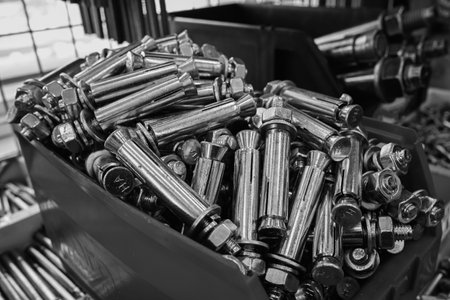 pile of bolts close-up for construction.