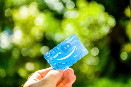 CLUJ, ROMANIA - NOV 08, 2019: eMAG logo on their credit card. eMAG is the biggest e-commerce, retail website in Romania. eMAG - nicknamed the Amazon of Romania.