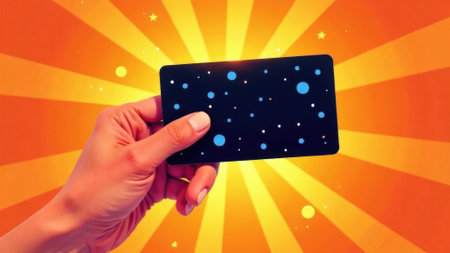 A hand is holding a card featuring a starry design, set against a vibrant sunburst background. The bright colors create an energetic atmosphere, perfect for creative projects or promotions