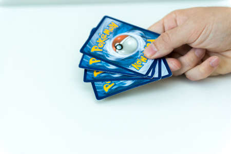 Florianopolis, Brazil, July 13, 2019: close-up of a man hand holding Pokemon Cards. Brazilian youths perform battles using these collectibles cards.