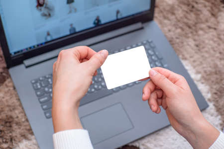 girl holding a bank card in her hands on a background of blurred nubuck. Online shopping. loans