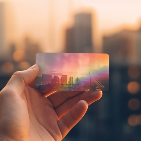 A hand holding a card with a picture of a city in the background. Generative AI image.