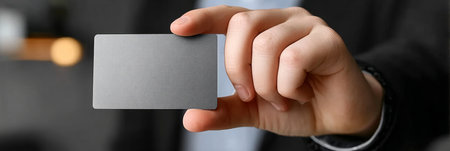 Professional holding a blank card for banking or business purposes in a modern aesthetic setting.