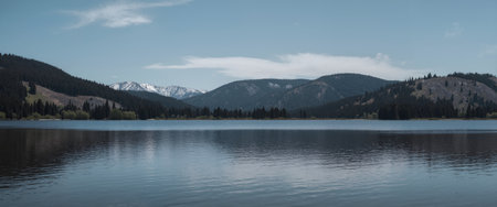 Panoramic view of mountain lake with reflection in water. Beautiful summer landscape.