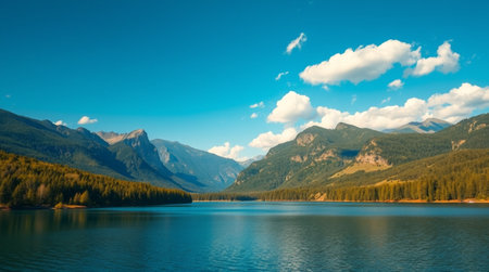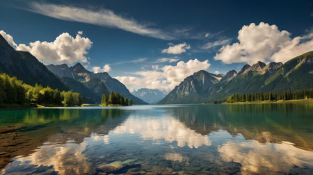 This stunning image captures a tranquil mountain lake surrounded by lush greenery and majestic mountains, reflecting a picturesque sky filled with clouds.