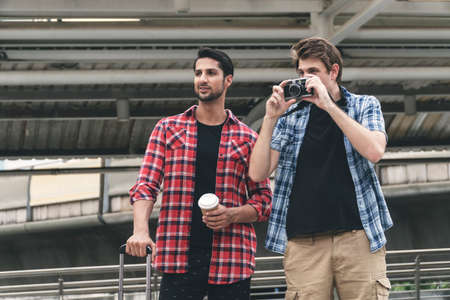 Handsome young man taking photo using camera on street in city while travel with his friend together. Two adventure traveler man take picture while travel in holiday.