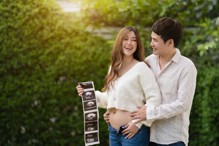 Happy Young Pregnant woman holding showing ultrasound scan photo. Smiling Asian Mother with sonogram of her unborn baby. Concept of pregnancy, Maternity prenatal care