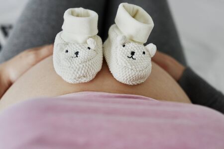 Closeup pregnant female holding cute childish booties on huge tummy relaxing at home awaiting baby